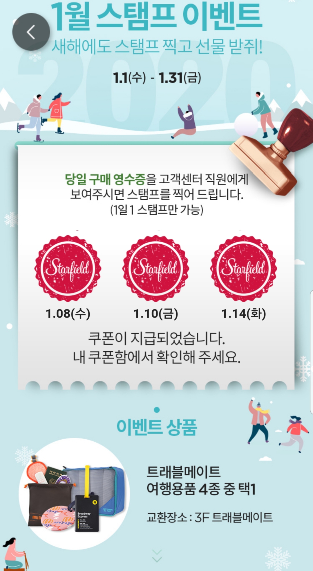 스타필드에서 월마다 진행되는 이벤트 상품을 이번달에도 도전 하였다~매달 1일이 되면 어떤 이벤트 상품이 나올지 궁금하다~^^이번달에는 여행용품 상품이다..스타필드 부천점이 가까운 곳에 생겨서 얻는 재미와 행복이 무궁무진하다.ㅎ